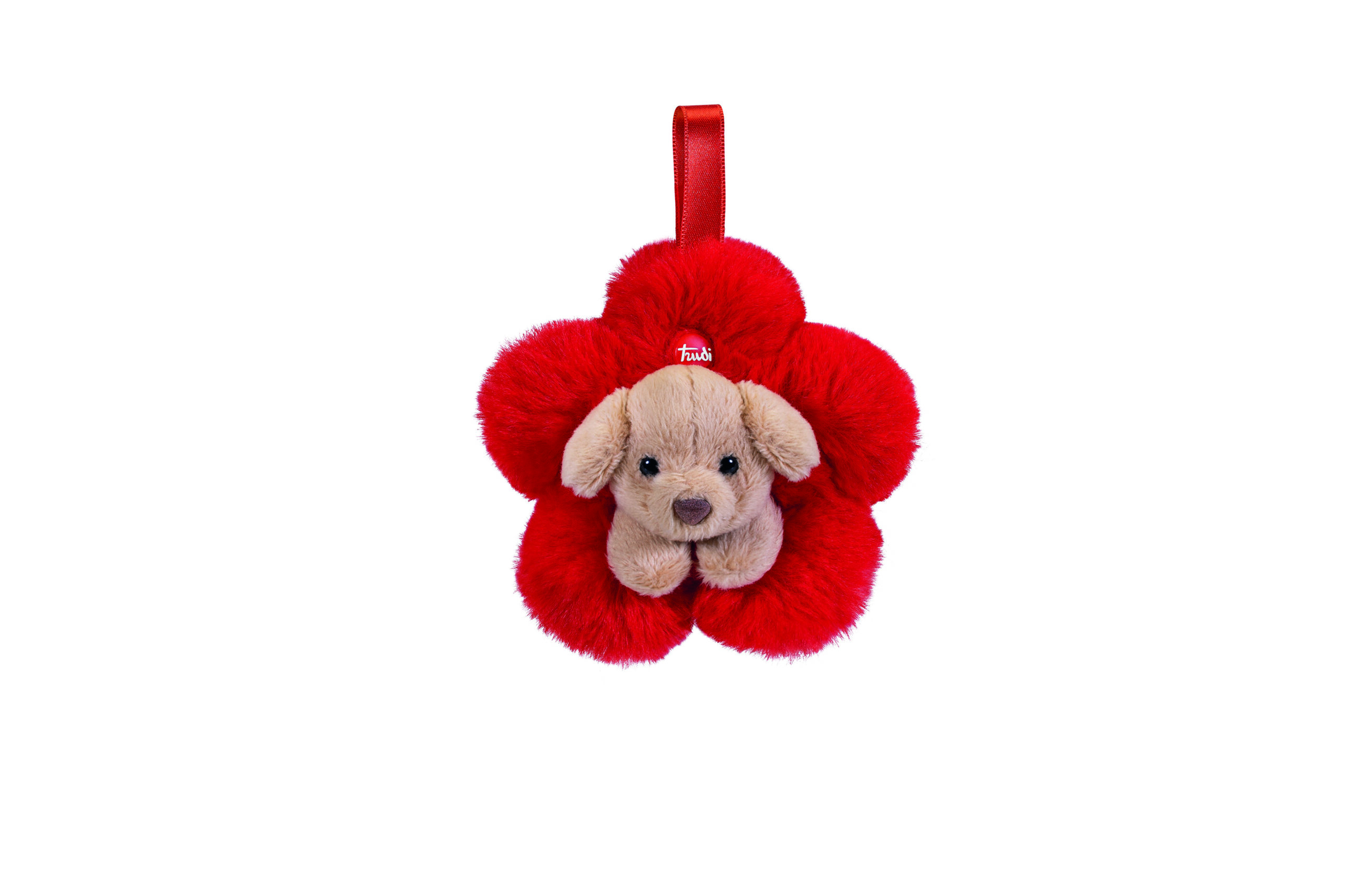 A surprise among the petals! A sweet little dog peeks out from a soft red flower, ready for lots of cuddles.